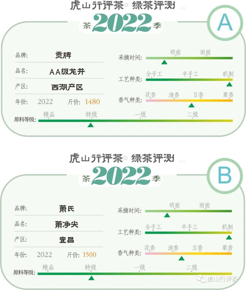本次代表龙井茶的是贡牌AA级,采摘时间是3月27日。等级是特级,产区标注为西湖,合斤价为1480元。代表邓村绿茶的是萧氏茶叶萧净尖,采摘时间为明前,等级为特级,合斤价为1500元。