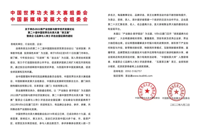 由商务部主办的第二十二届中国国际投资贸易洽谈会以“全球发展:共享数字机遇 投资绿色未来”为主题,将于9月8日至9月11日在厦门市举办。借助盛会契机,由中国管理科学研究院品牌推进委员会指导,中国世界功夫茶大赛组委会、中国新媒体发展大会组委会、中国茶业发展研究院联合主办,厦门柒玖捌传媒科技有限公司、乐享茶室(厦门)科技有限公司、茶业通网策划承办,以“产业融合 数字驱动”为主题的2022茶产业创新与数字经济发展论坛、第二十届中国世界功夫茶大赛“茶王赛”暨茶企《品牌与人物》评选活动全国征募!论坛峰会与颁奖盛典将于2022年9月6日在厦门召开!欢迎有实力、有品牌企业参会、参评、参赛,共同推动茶产业国际化发展。