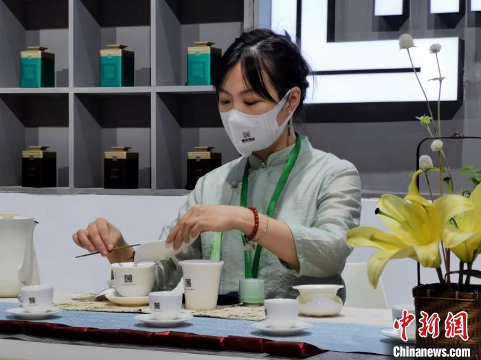 在2022第十五届安徽国际茶产业博览会现场,茶艺师正在泡茶。