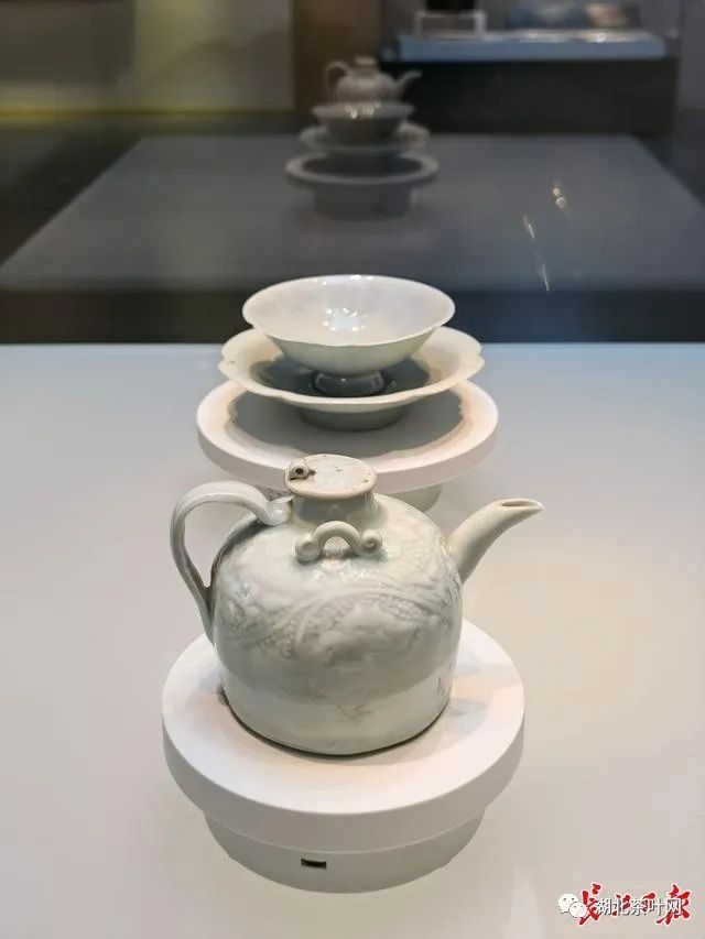 另一件同样来自湖北省博物馆的北宋青白釉印花执壶,1965年出土于汉阳十里铺,质地细白,釉色匀润,白中泛青,为江西景德镇窑烧造。