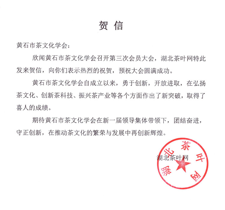欣闻黄石市茶文化学会召开第三次会员大会,湖北茶叶网特此发来贺信,向你们表示热烈的祝贺,预祝大会圆满成功。