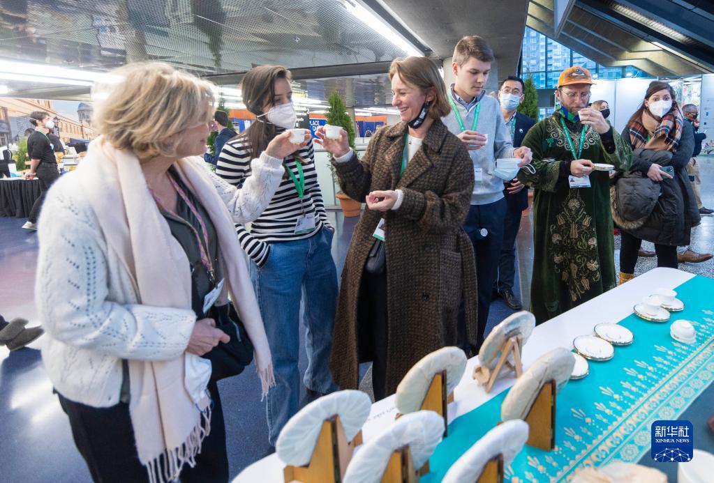 12月7日,在加拿大蒙特利尔会议中心,与会者在《生物多样性公约》第十五次缔约方大会(COP15)第二阶段会议的中国角品尝中国茶饮。 新华社发(邹峥摄)
