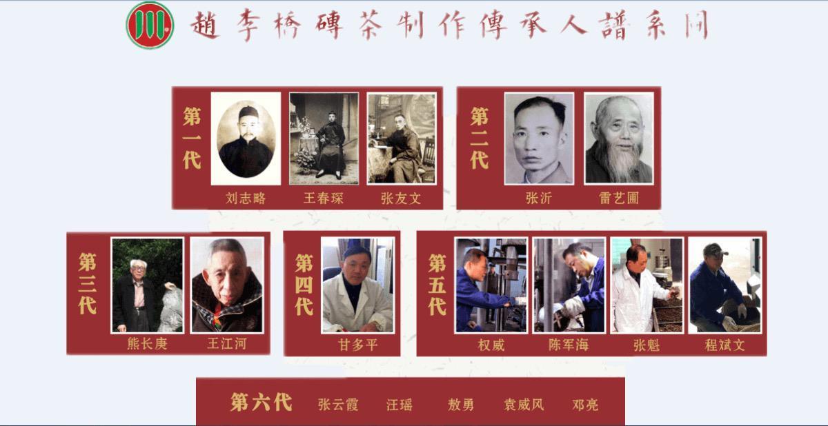 繁复的制作技艺,一代代茶人一脉相传,薪火不息。赵李桥茶厂里有一幅砖茶制作技艺代表性传承谱系图,是他们的“传家宝”之一。目前,“赵李桥砖茶制作技艺”已经传承到第六代,现有省级非遗代表性传承人1名,市级代表性传承人4名,县级代表性传承人5名。赵李桥茶厂鼓励各级非遗传承人收徒传艺,90后传承队伍也已正式登上舞台。