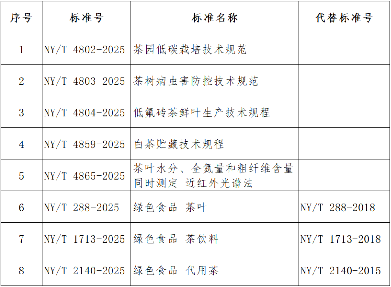 (湖北茶叶网消息)日前,农业农村部正式发布公告,批准《苹果矮砧栽培建园技术规范》等364项中华人民共和国农业行业标准,自2026年5月1日起实施。该批标准文本由中国农业出版社出版,可于2026年4月1日起在农业农村部农产品质量安全中心网站(http://www.aqsc.agri.cn)查阅。