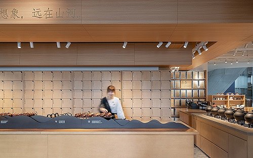 tea'stone 的零售区往往布局在入门处的独立区域,有完整的货架陈列,以销售茶叶和茶器为主;而另一边的沉浸式茶体验也是一大亮点。创新研发设计的茶吧台,包含待客、制茶和展示三大功能,满足运营功能的同时,又体现出了中国茶的千年泡茶文化历史。