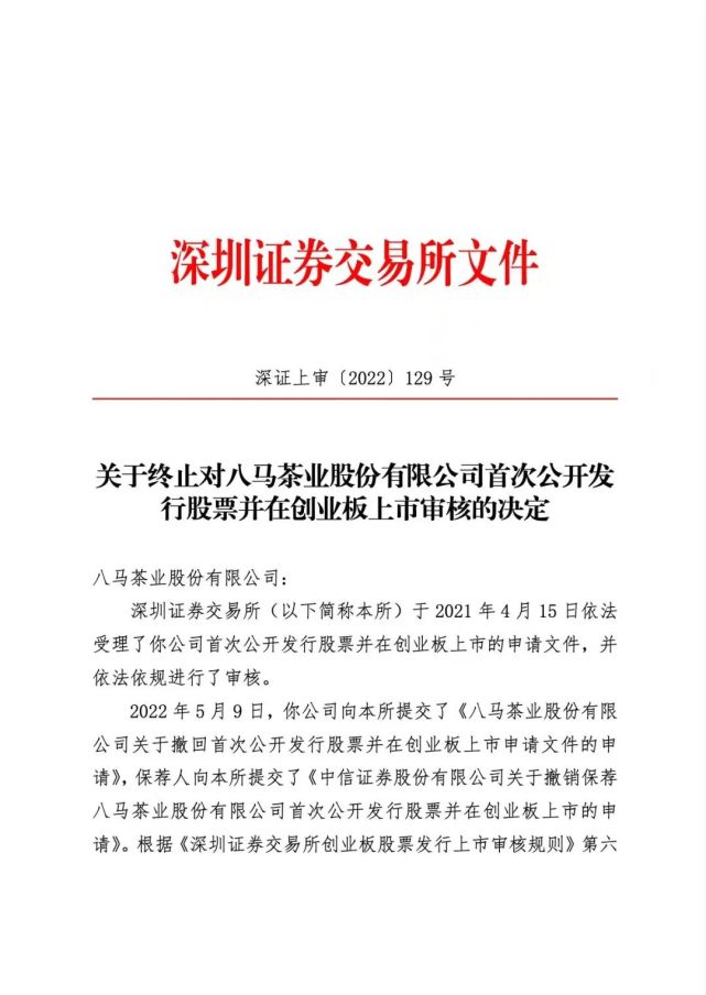 5月10日,深圳证券交易所发布“关于终止对八马茶业首次公开发行股票并在创业板上市审核的决定”公告,决定终止对八马茶业首次公开发行股票并在创业板上市的审核。