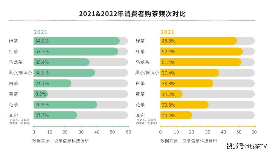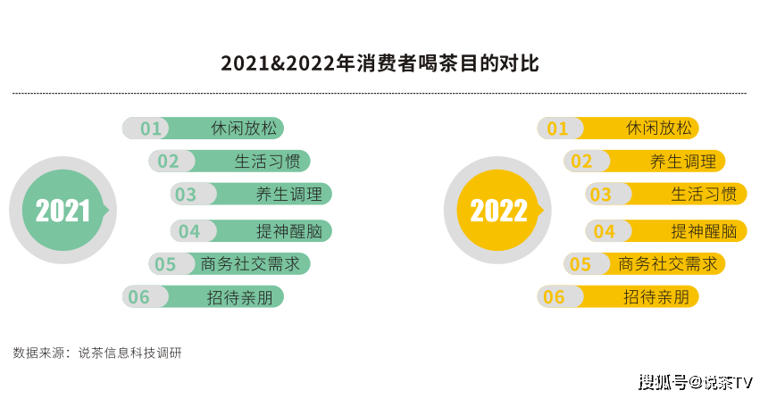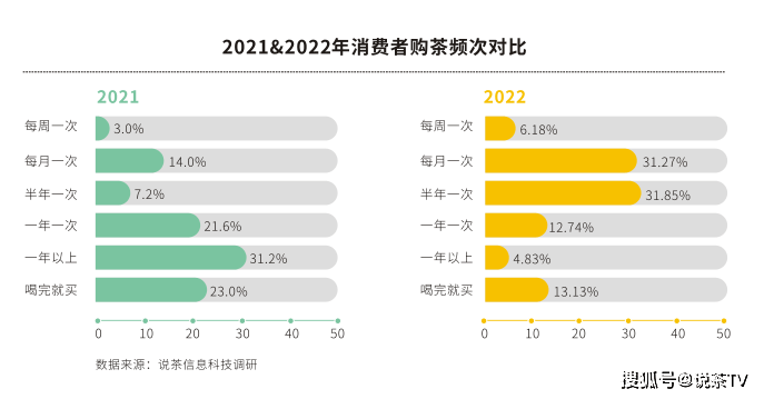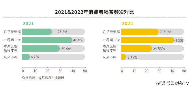 从更微观的消费者调研数据看,2022年消费者在喝茶频次、饮茶目的、茶类偏好、购茶频次上,相比去年出现明显的变化。
