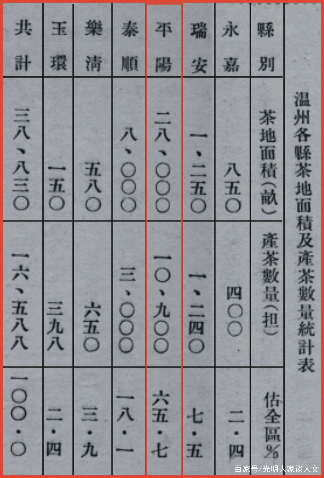 温州的各县土地面积,山地面积约占三分之二以上,土质气候均极宜植茶,其中以平阳县为种植面积最多。据民国22年(1933)浙江省茶叶种植面积统计,温州区茶叶种植面积共计38830亩,其中平阳县种植面积为28000亩,占温州茶区总面积的65.7%,是温州区最主要的茶叶产区。可知温茶出处最多为平阳。泰顺、瑞安二县为次,永嘉、乐清、玉环三县出产数甚微。清末民初《温州茶述》中载:温州之茶,以平阳南北港为大宗....北港以南雁为最,南港以华洋、藻溪为多,江南垟-金乡多出白眉。