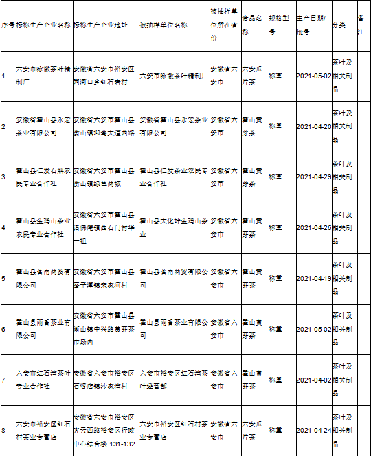 中国质量新闻网讯 6月6日,安徽省六安市市场监管局发布2022年第19期发布食品安全抽检信息。本期抽检8批次茶叶及相关制品,均合格。