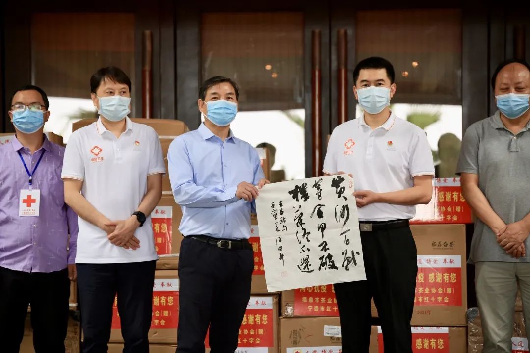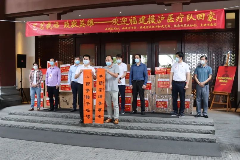 6月9日,由福建省美术家协会、福建省书法家协会、福建省美术家协会书法家协会党支部、宁德市红十字会、福鼎市茶业协会、太姥书画院发起的“艺茗载福 致敬英雄——欢迎福建援沪医疗队回家”活动在福州举行。援沪医疗队成员和与会领导、企业等人共同参与活动。