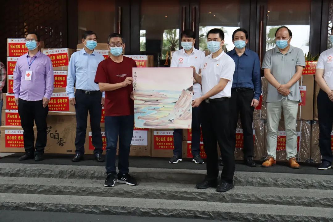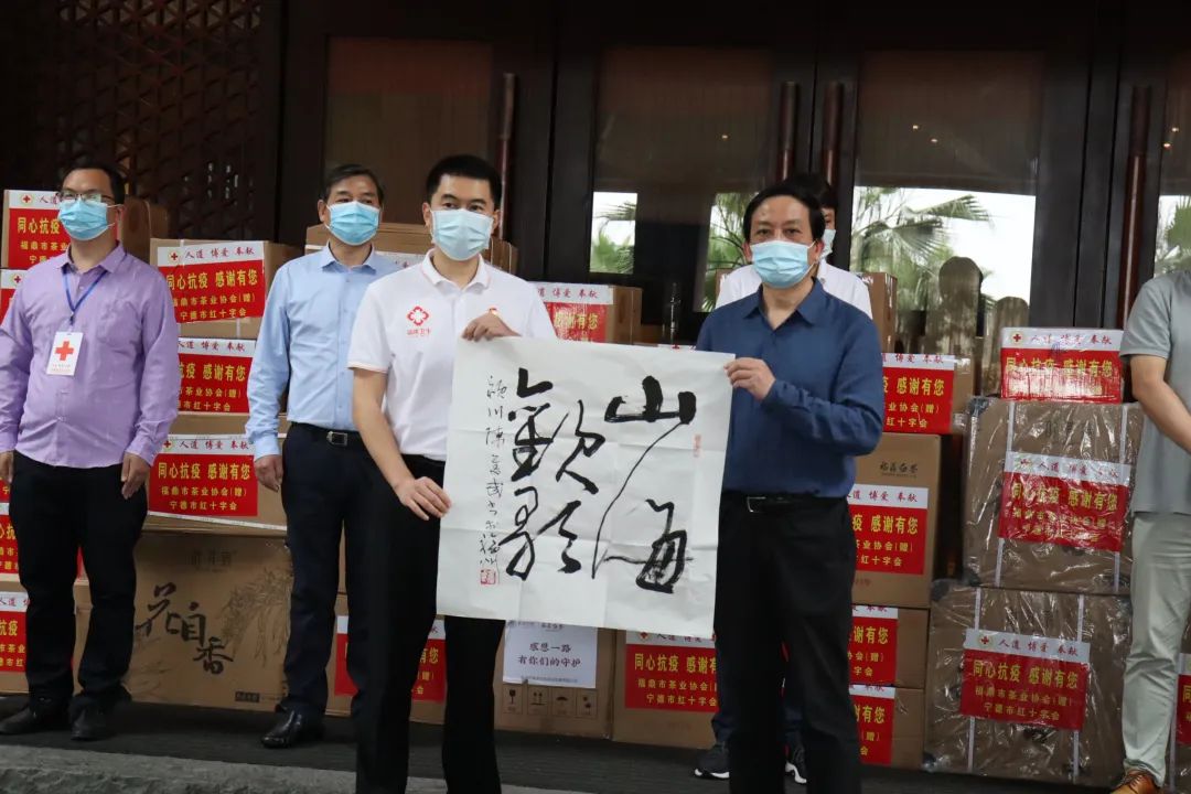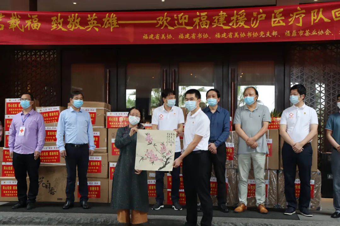 福建省美术家协会、福建省书法家协会、福鼎市茶业协会、福鼎市美术家协会分别派出代表向援沪医疗队赠送作品。