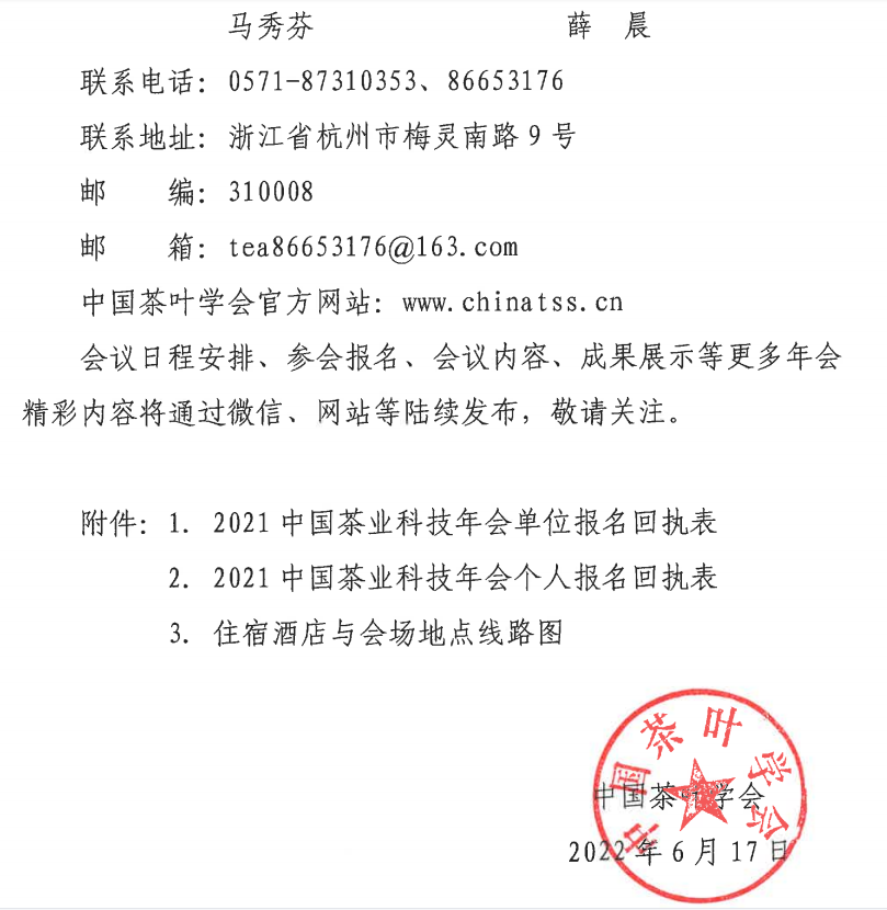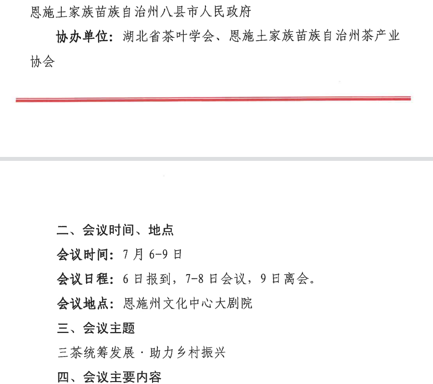 由中国茶叶学会、湖北省农业农村厅、湖北省科学技术协会、恩施土家族苗族自治州人民政府共同主办,湖北省茶叶学会等单位协办的“2021中国茶业科技年会”定于2022年7月6日至9日在恩施市召开。